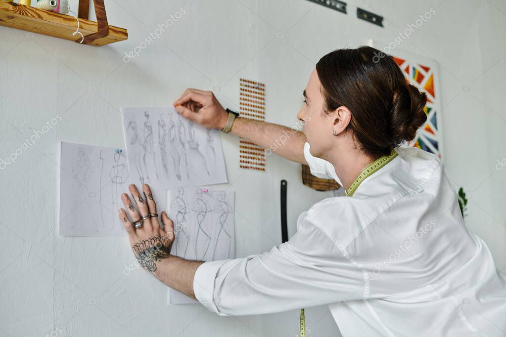 - A young man with a tattoo arranges sketches for a clothing restoration atelier.