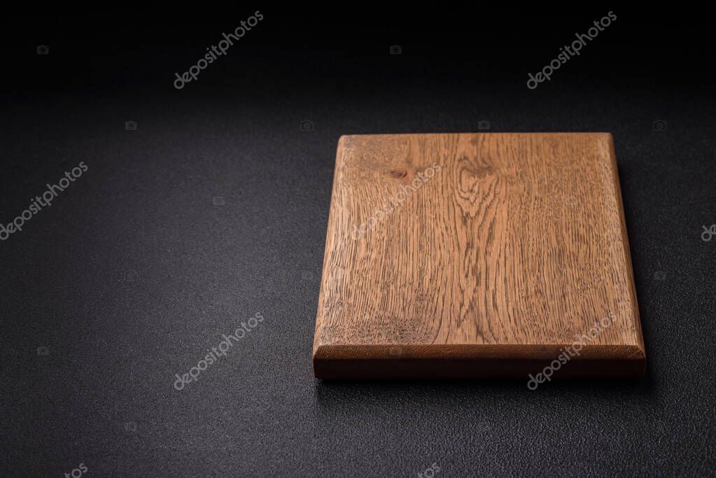 - Empty wooden cutting board on dark textured concrete background. Cutlery, preparation for dinner