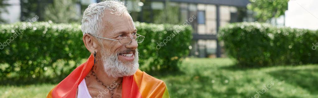 - A mature gay man with tattoos and a grey beard smiles while holding a rainbow flag outdoors.