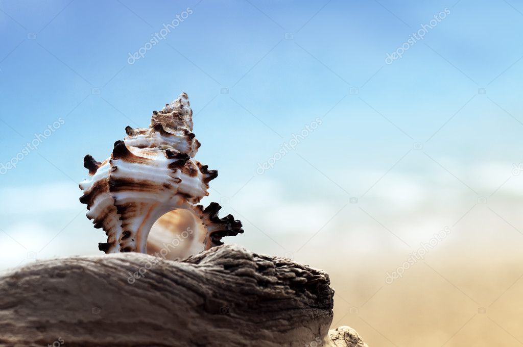 - closeup tropical shell on sandy sunny beach, natural summer back