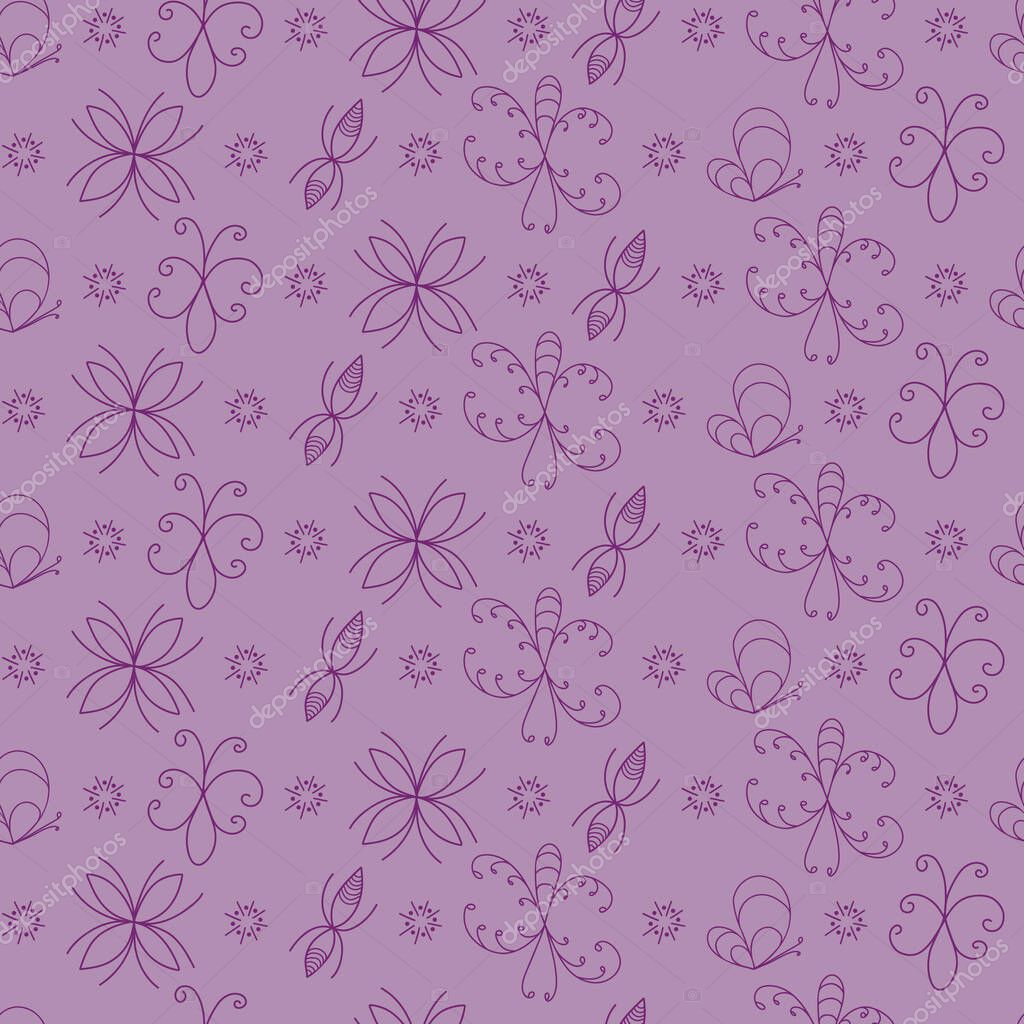 - Dark purple line art of imaginary bugs on purple create a textured seamless pattern print great for home or kitchen decor, quilt and apparel fabrics, or paper products.