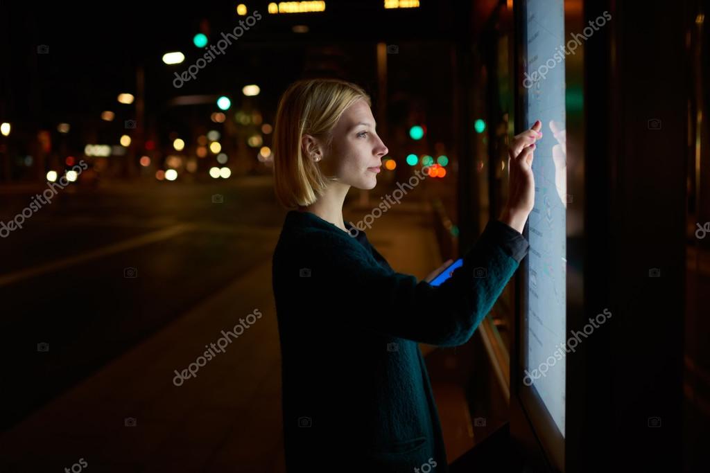 Caucasian young woman verifies account balance on banking application via modern kiosk with digital sensitive screen, charming female touching big digital display with reflected on her screen light