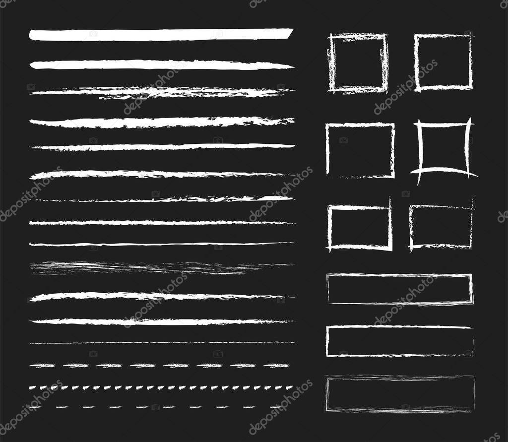 - Chalk graphic elements. Vector set of chalk brushes, grunge lines, strokes, square frame, rectangle. Hand drawn elements on school blackboard. Borders with a rough chalk texture. Horizontal lines