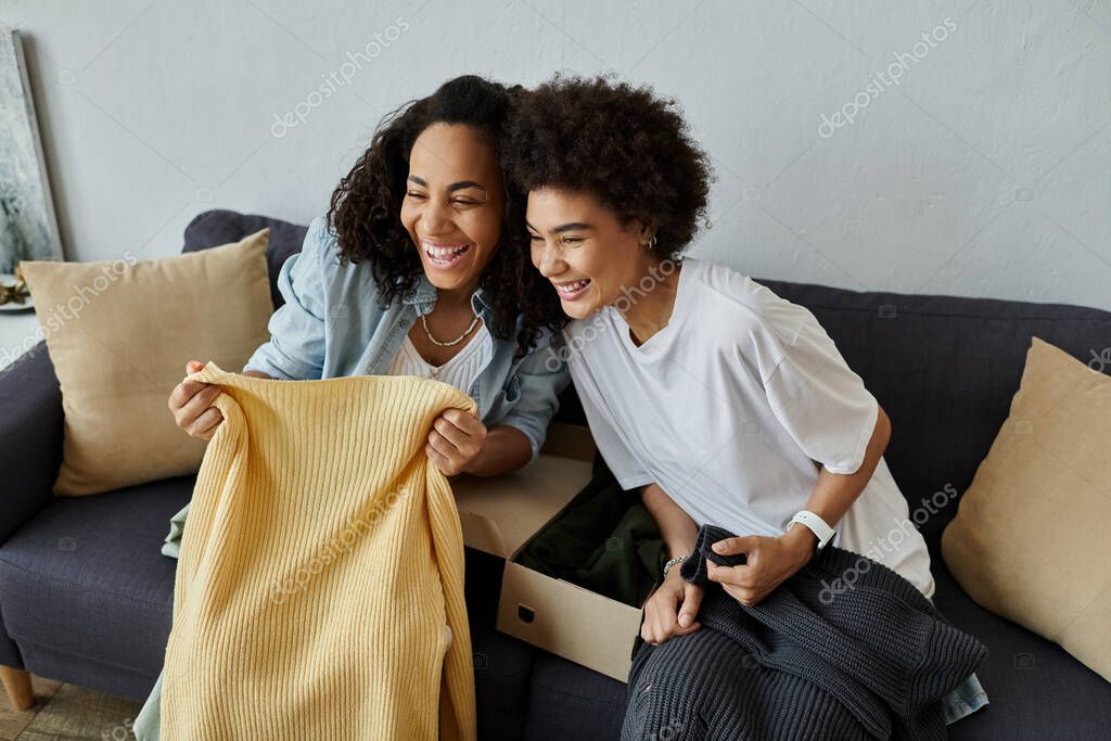 - Two partners joyfully transform their clothes on a cozy sofa.