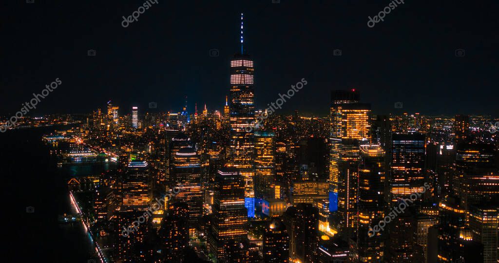 - Night Aerial Photo with the One World Trade Center Skyscraper with Lights in Office Rooms Inside. Helicopter Flying Close to the Building with a View
