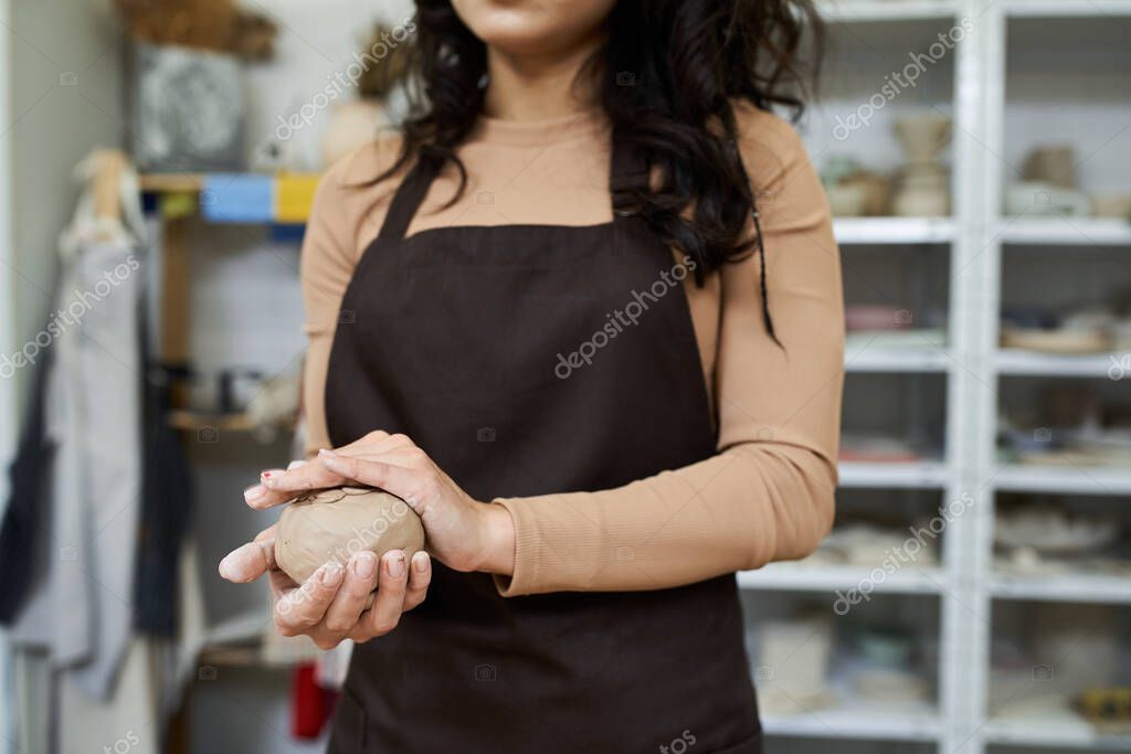 - Talented appealing woman with apron making pottery.