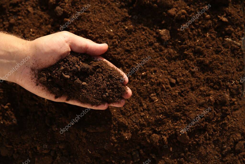 - Man holding pile of soil outdoors, top view. Space for text