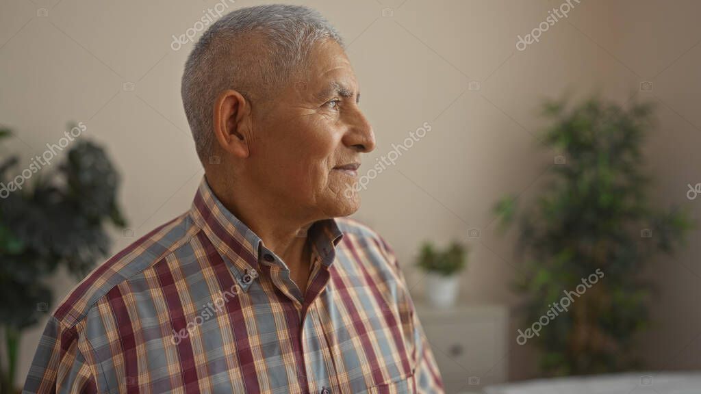 - Elderly hispanic man with grey hair looking sidewards, indoors in a homey living room.