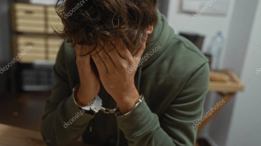 YOUNG MALE MAN WATCH EMOTION BEARD INDOOR STRESS JUSTICE LAW LEGAL ROOM CRIME TROUBLE WAITING SERIOUS SAD POLICE HANDCUFFS FEAR OFFICER ANXIETY GRIEF DESPAIR CAPTURE CONCERN WORRY INVESTIGATION GUILTY DEFEATED QUESTIONING HISPANIC ARREST ENFORCEMENT PRISONER INTERROGATION CHARGED HANDCUFFED DESPERATE EVIDENCE INQUIRY CUSTODY INCARCERATION SUSPECT STRESSFUL APPREHENSION ACCUSED DETAINED DEMORALIZED