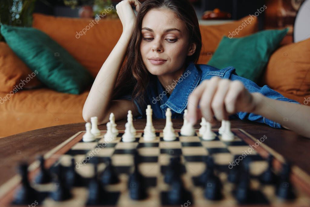 - Woman sitting on couch playing intense game of chess on table in living room setting