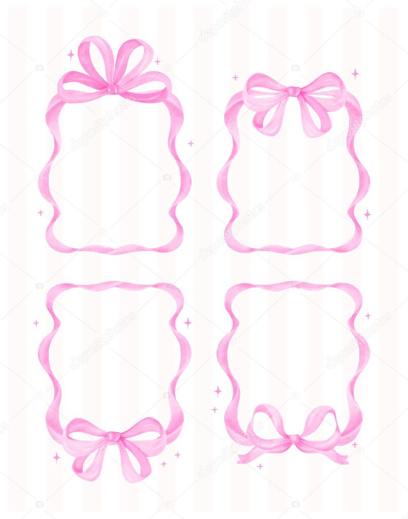 - Coquette Pink Ribon bow Vertical Frame Watercolor set Preppy Retro Grandmillennial style collection