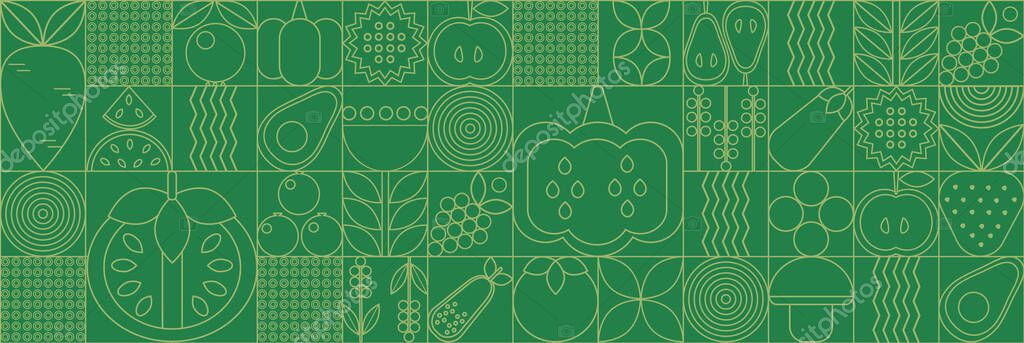 - Bauhaus vegetable abstract. Geometric line drawing. Vegetables and fruits seamless pattern bauhaus. Natural flower plant with simple shape, abstract eco farming concept. Vector minimal banner