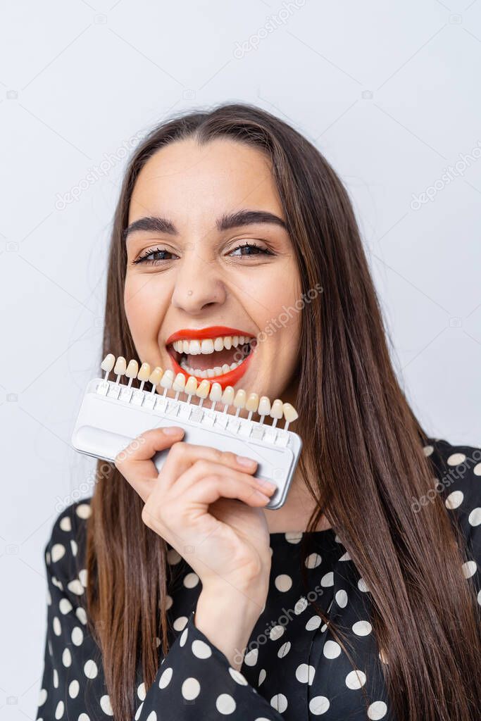 - Woman smiles with dental shade guide indoors. A joyful woman with long hair holds a dental shade guide close to her face