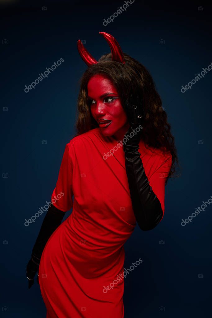 FUN RED VIBRANT BEAUTIFUL CELEBRATION FESTIVE ELEGANCE PARTY YOUNG BEAUTY MODEL PLAYFUL CREATIVITY FASHION CHARACTER EXPRESSION POSE PRETTY INSPIRATION FANTASY FESTIVAL STYLISH GLAMOUR WOMAN ACCESSORIES MAKEUP SHADOW TRENDY CHIC HORNS HALLOWEEN BOLD COSTUME SPOOKY THEATRICAL DEVIL DRAMA ALLURE ATTIRE WIG MYTHICAL ARTISTRY DARK BLUE FESTIVE SPIRIT