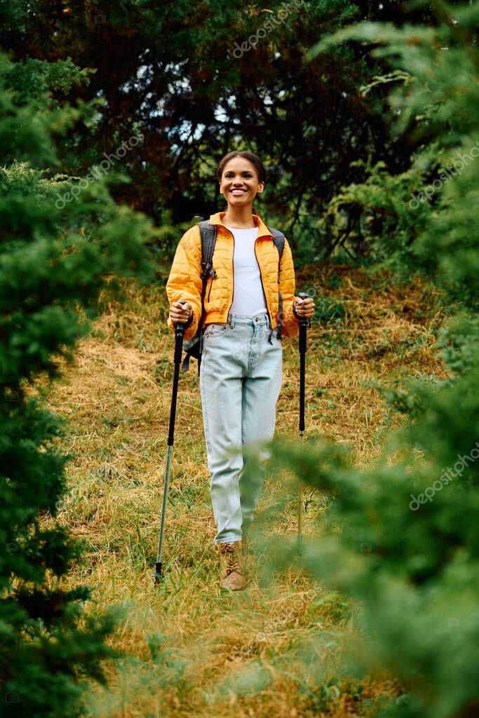 TRAVEL YOUNG SMILING RELAXATION HAPPINESS JOY NATURE AUTUMN FOLIAGE DIVERSITY WOMAN FOREST WARMTH MOUNTAINS SCENERY FITNESS EXERCISE WOODLAND JOURNEY HIKING ADVENTURE SOLITUDE BACKPACK TOURIST WILDERNESS TREKKING EXPLORATION EXPLORE OUTERWEAR TRAILS YOUNG WOMAN BLACK WOMAN AFRICAN AMERICAN HEALTHY LIFESTYLE FALL SEASON FRESH AIR VIBRANT COLORS GREEN TREES ACTIVE LIFESTYLE PUFFER JACKET SEASONAL CHANGE HIKING POLES OUTDOOR ADVENTURE BRIGHT JACKET