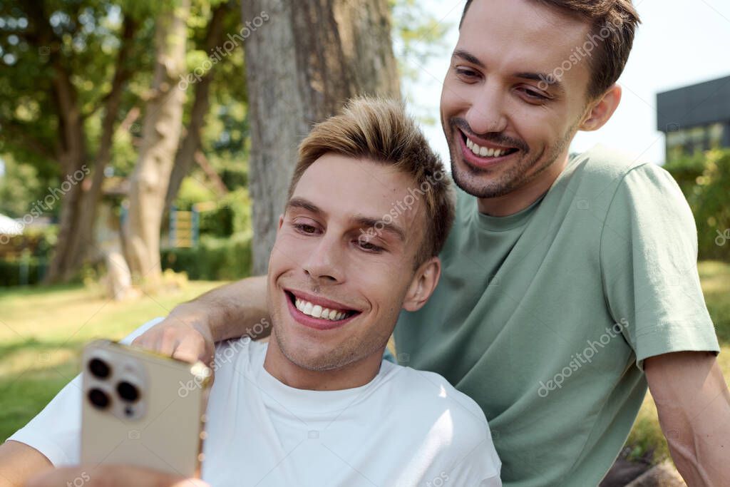 - A cheerful gay couple smiles at their phone, sharing a delightful moment in the park.