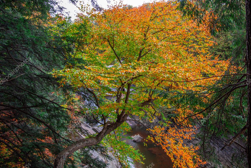 River steam in picturesque forest during fall season, autumn foliage on trees