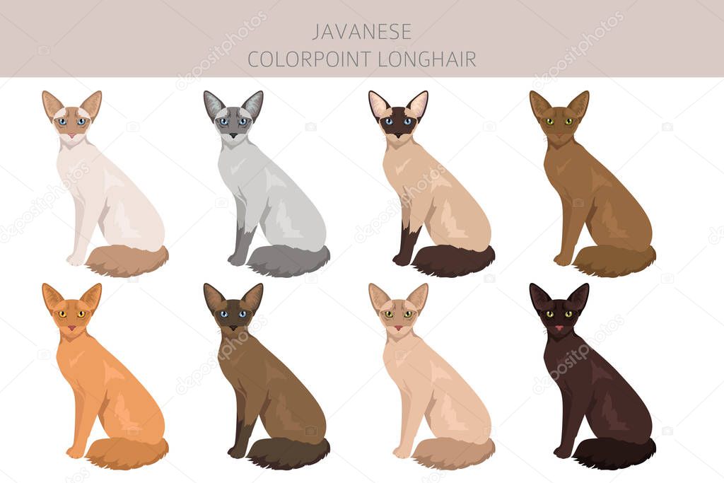 - Javanese cat clipart. Colorpoint Longhair cats all coat colors set. All cat breeds characteristics infographic. Vector illustration