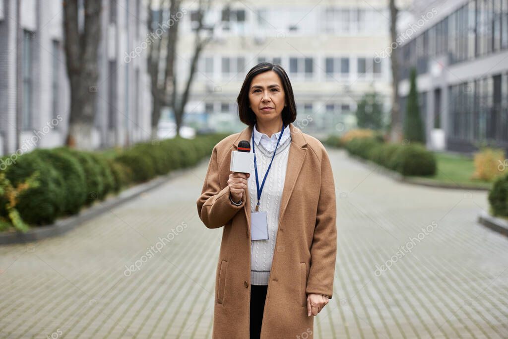 - A multiracial journalist in a beige coat holds a microphone while reporting live in an urban environment.