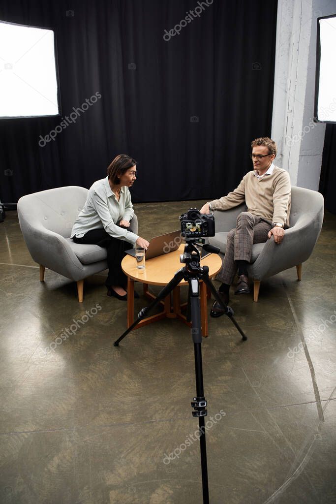 TABLE BACKGROUND PERSPECTIVE STUDIO CAUCASIAN MAN NEWS WOMAN COMMUNICATION CONVERSATION PROFESSIONAL BROADCAST CAMERA DISCUSSION PROFESSION LIGHTING MEDIA KNOWLEDGE ANALYSIS SEATING MEDIUM JOURNALIST INTERVIEW INTERACTION STORYTELLING APPROACH DIALOGUE QUESTIONS EXPERT SPECIALIST PODCAST SETUP ANSWERS MULTIRACIAL MULTICULTURAL ENGAGING REPORTING INTERVIEWING INSIGHTS MIDDLE AGED DIGITAL CAMERA