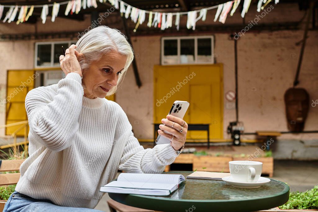 - A stylish mature woman engages with her smartphone while savoring coffee and jotting notes.