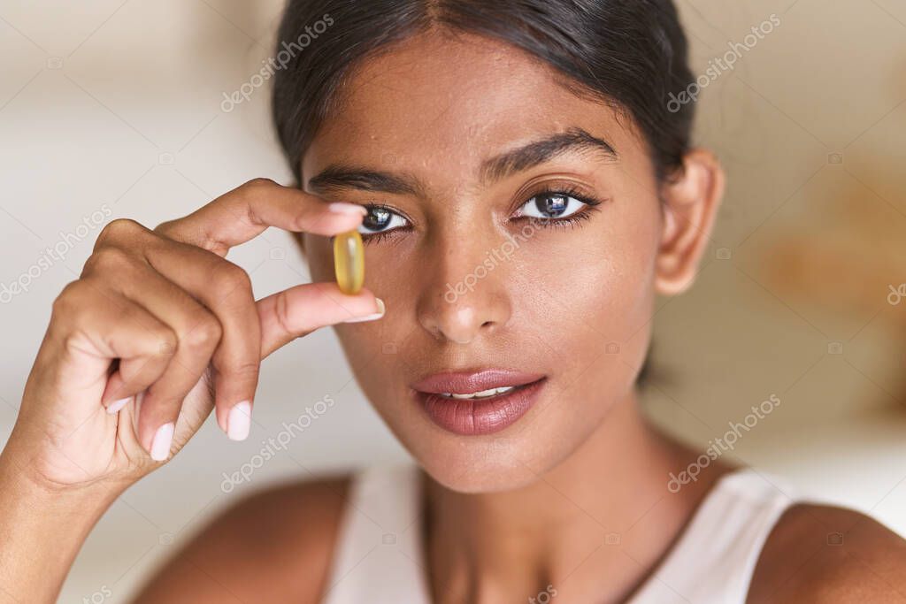 - Omega-3 Supplement. Beautifull Woman Holding a Fish Oil Capsule, Emphasizing Health Benefits and Lifestyle. Bright, Inviting Atmosphere Highlighting Wellness and Nutritional Insight.