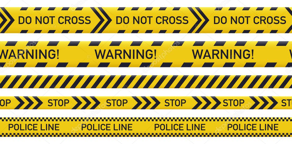 - Warning yellow lines. Police crime barrier, caution danger ribbons and security tapes flat vector illustration set. Security line collection