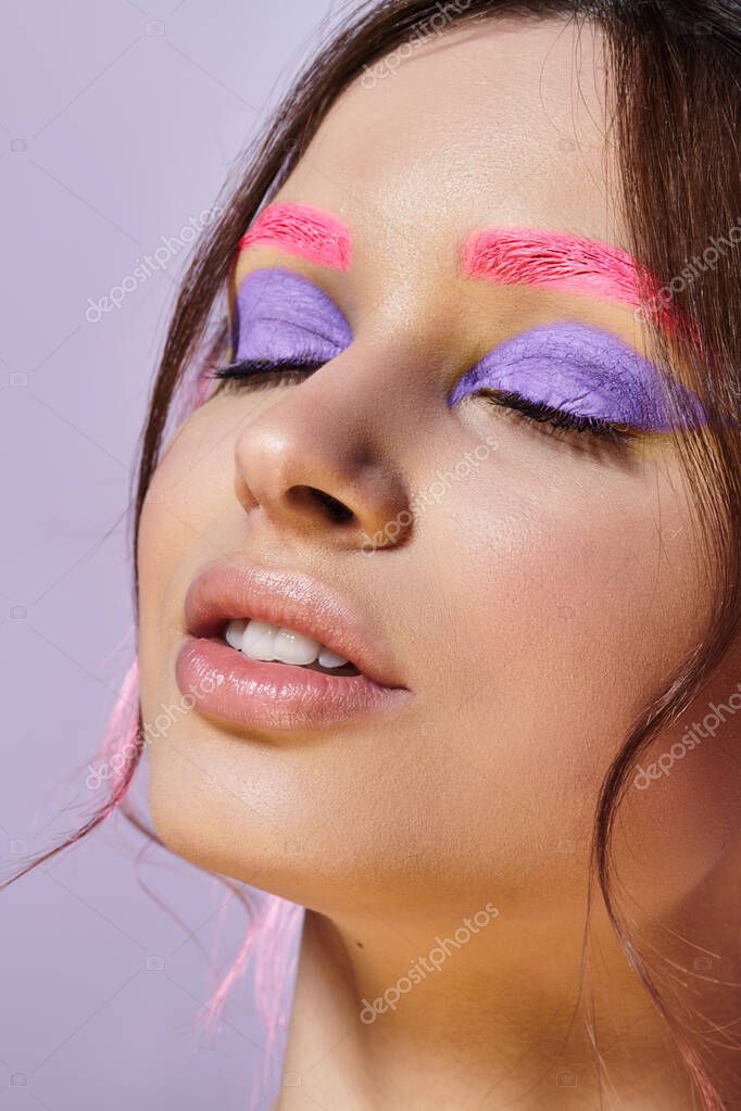 - Young woman showcases her beauty with striking purple eyeshadow and pink eyebrows in studio.