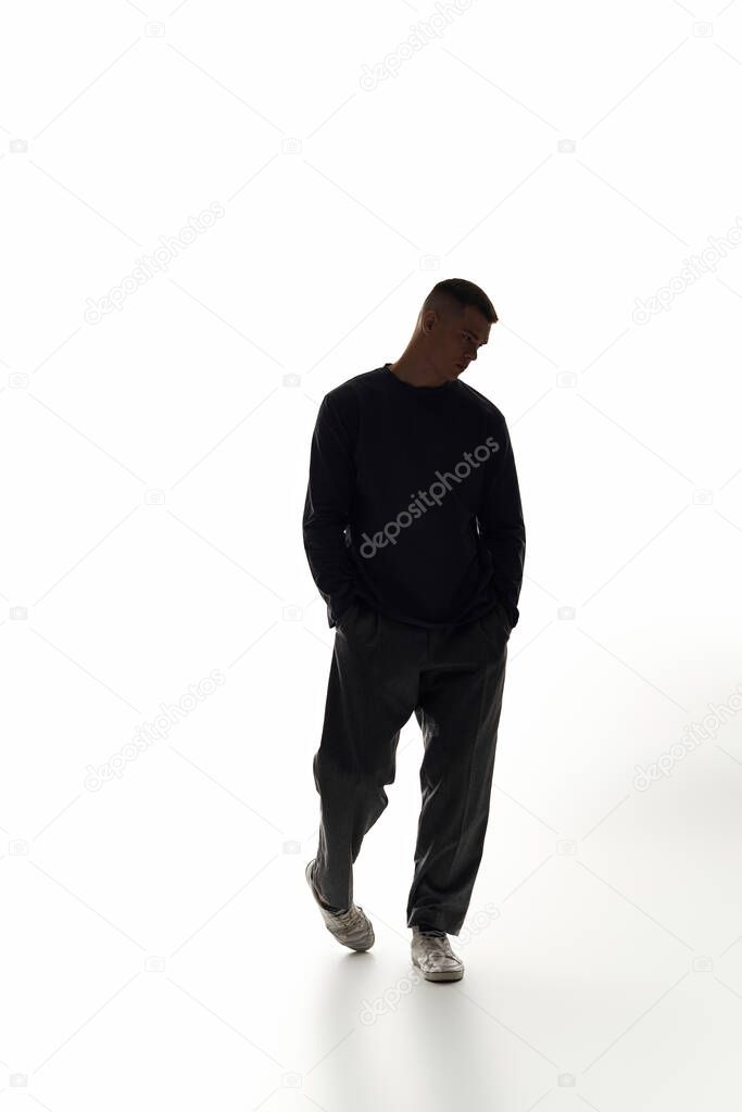 LEISURE DESIGN SIMPLICITY BRIGHT STUDIO ELEGANCE YOUNG SCENE ABSTRACT PORTRAIT YOUTH MAN WALKING FASHION INDIVIDUALITY MODERN CHARACTER EXPRESSION POSE BACKDROP CREATIVE MOTION INDOOR STYLISH MONOCHROME SHADOW MOVEMENT TRENDY ATMOSPHERE COMPOSITION WEAR LIGHTING HANDSOME SHOES RELAXED CONTEMPORARY CONFIDENCE POSTURE STRIDE PERSONALITY MINIMALISTIC AESTHETIC ARTISTRY VIBE YOUNG MAN CASUAL ATTIRE
