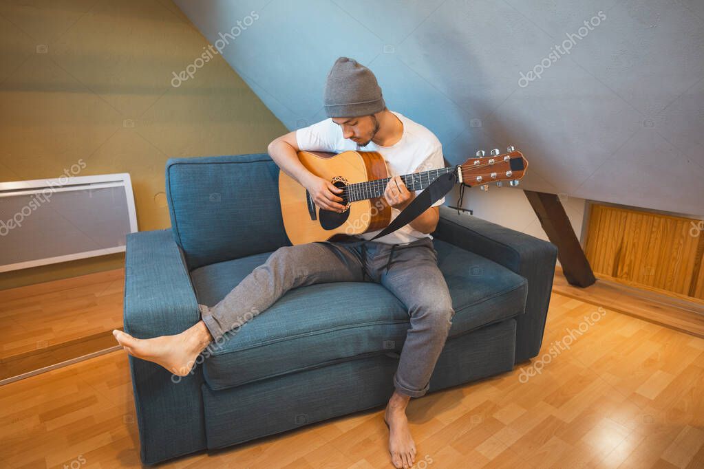 - Musician 26 years old sits barefoot on a cozy blue couch in an attic room, strumming an acoustic guitar, lost in the melodies, creating a relaxed and intimate atmosphere filled with creativity.