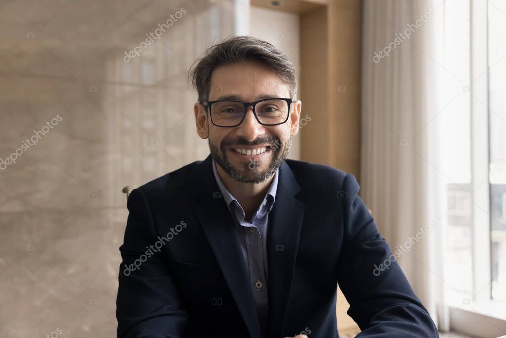 Mature businessman dressed in suit look at camera, engage in videocall to solve business related matters with colleague or corporate client. Virtual meeting event participant, profile picture portrait