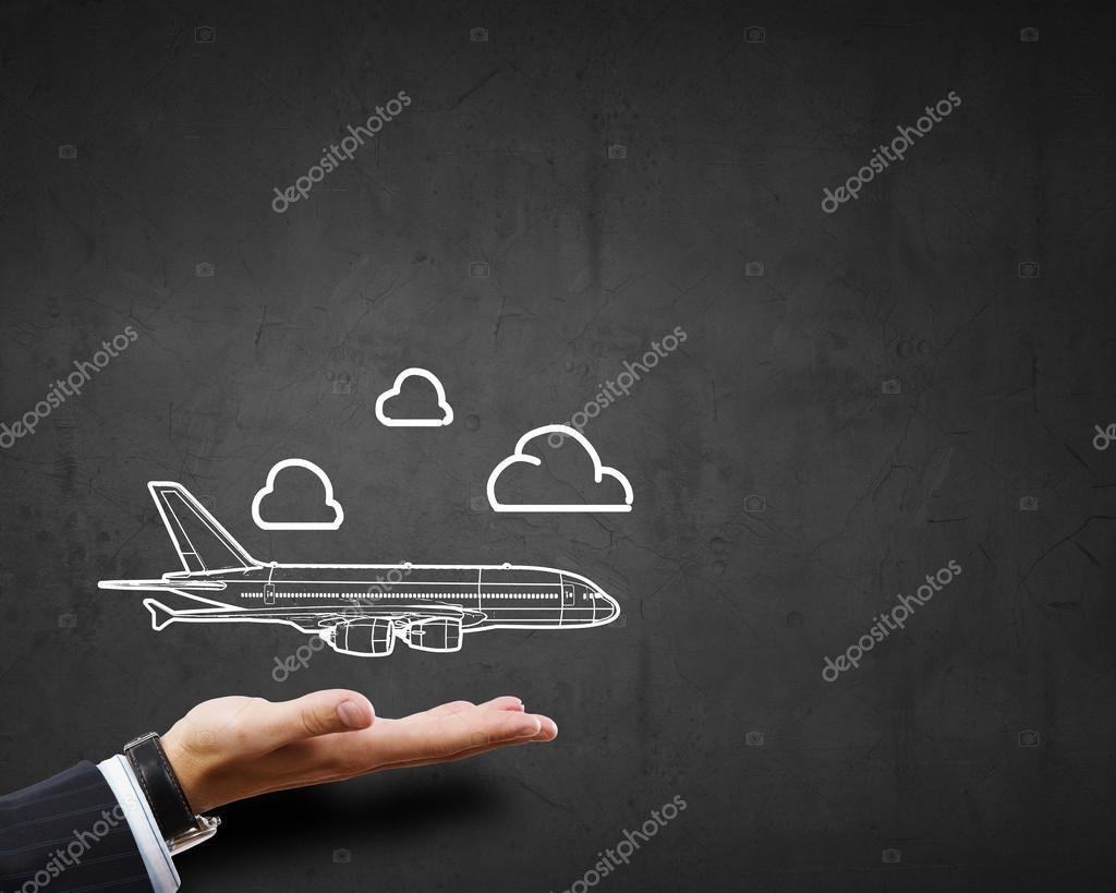Close up of businessman hand holding airplane sign