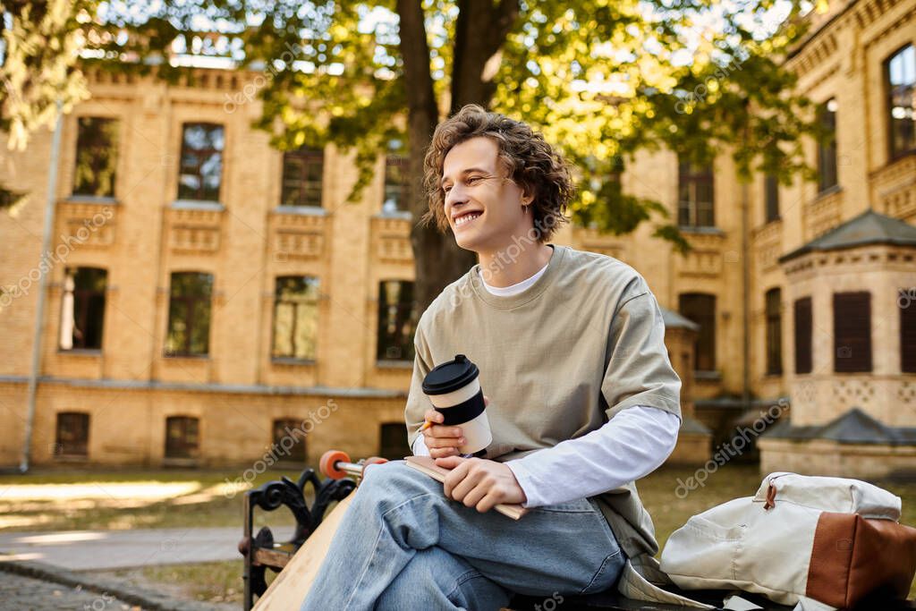 - A young man sits on a bench, happily sipping coffee among university buildings.