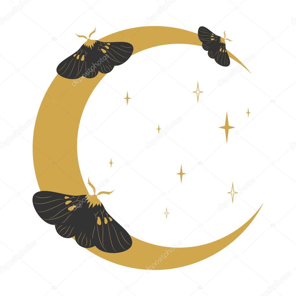 - Black moths sitting on a crescent moon. Celestial emblem with butterflies and crescent. Vector illustration.