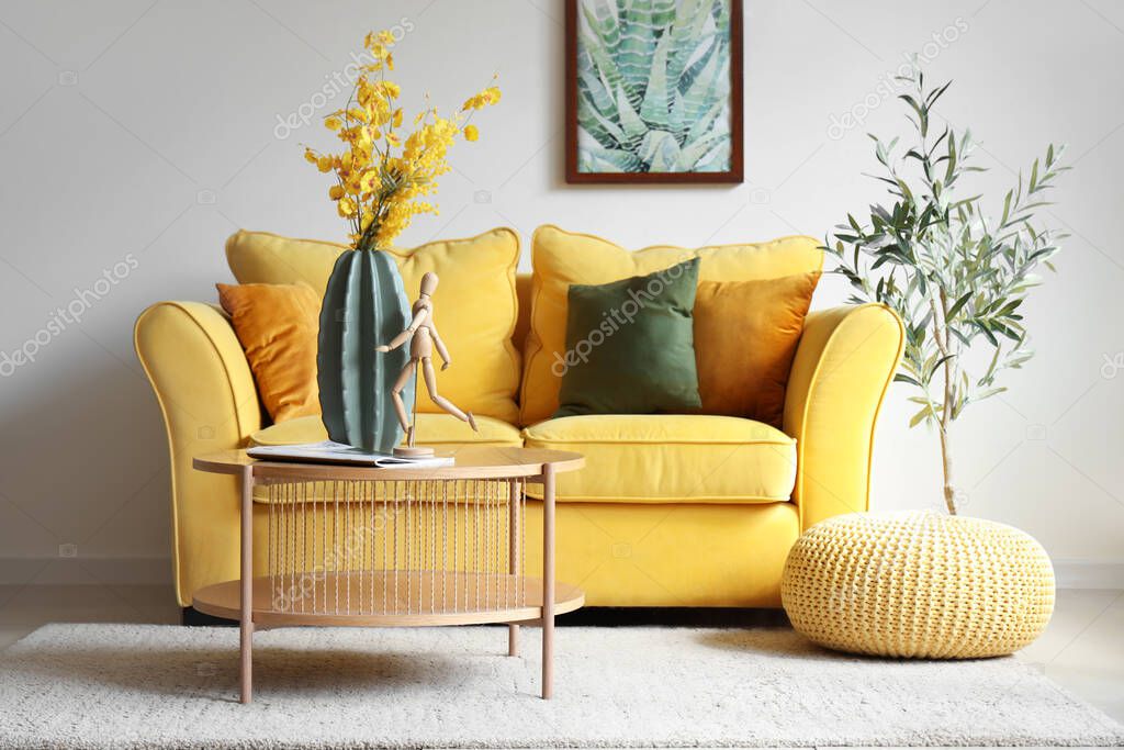 - Interior of living room with sofa and artificial flowers on table