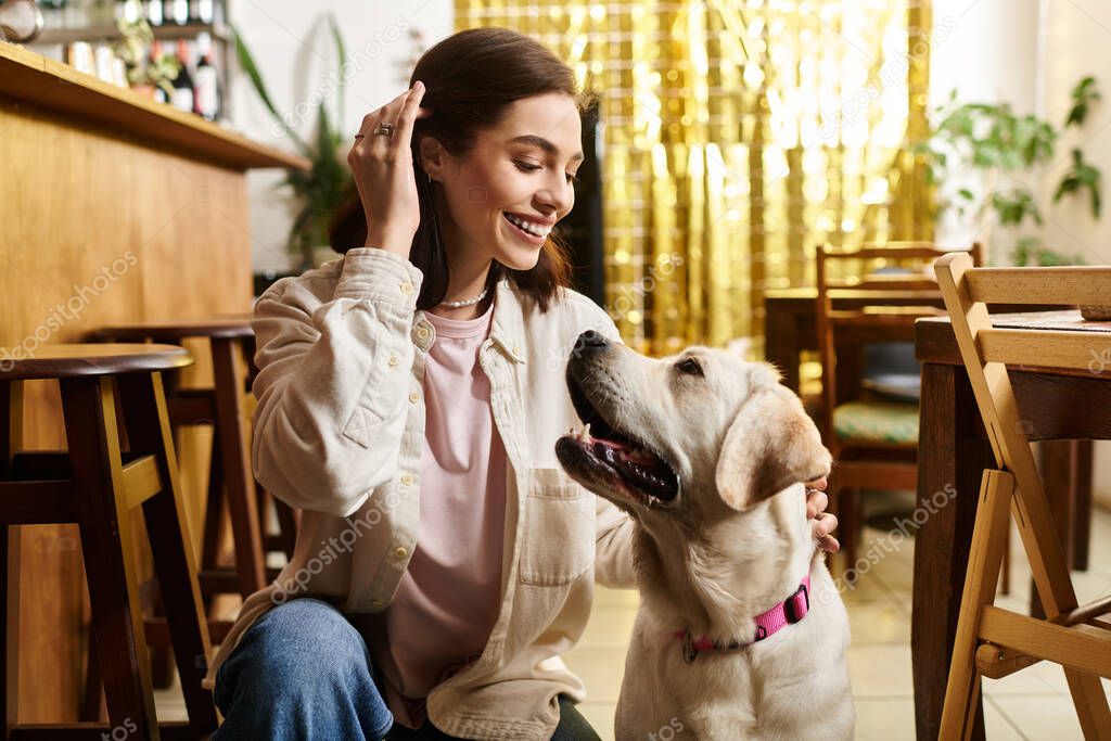- A young woman shares a delightful moment with her labrador at a vibrant pet friendly cafe.