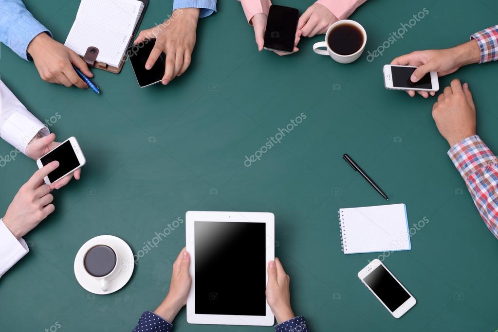 Top view of people hands at working process