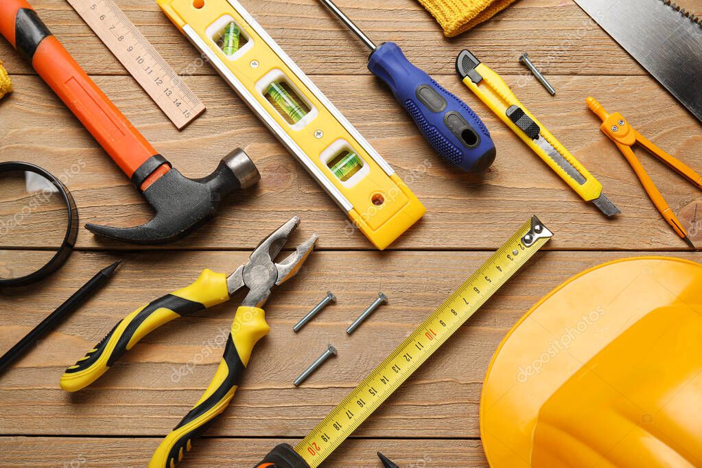 - Arrangement of different construction tools and hardhat on wooden background