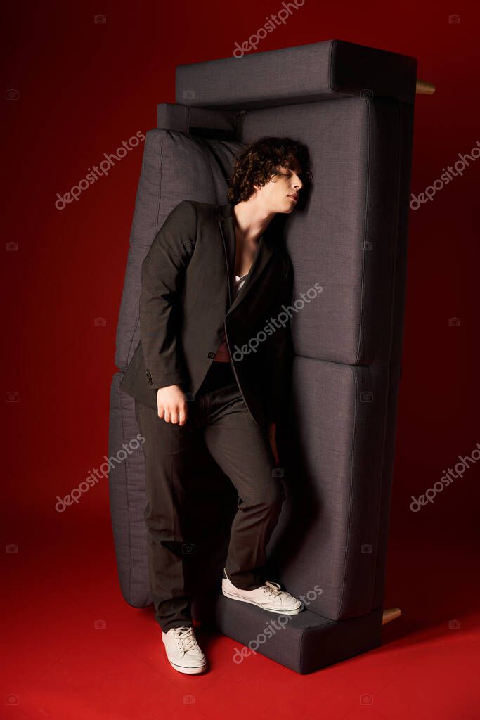 RED STUDIO ELEGANCE PORTRAIT CAUCASIAN FASHION EXPRESSION CREATIVE STYLISH ACCESSORIES CURLY CHARMING SERIOUS OUTFIT EXPRESSIVE POSING BOLD SLEEK SOFA COUCH ILLUSION CONFIDENCE ATTIRE CULTURED CHARISMATIC YOUNG ADULT YOUNG MAN FASHION INDUSTRY MALE MODEL STUDIO LIGHTING CONTEMPORARY DESIGN BLACK OUTFIT BLACK COLOR MODERN FURNITURE DRAMATIC BACKDROP UNIQUE STYLE FASHIONABLE LOOK CASUAL CHIC MODERN AESTHETIC YOUTHFUL ENERGY VISUAL AESTHETICS STYLISH ATTIRE CONFIDENT STANCE
