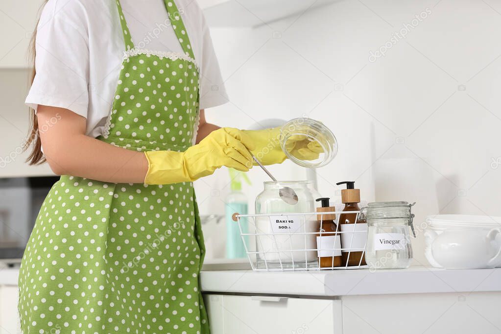 - Housewife taking spoon of baking soda for cleaning in kitchen, closeup