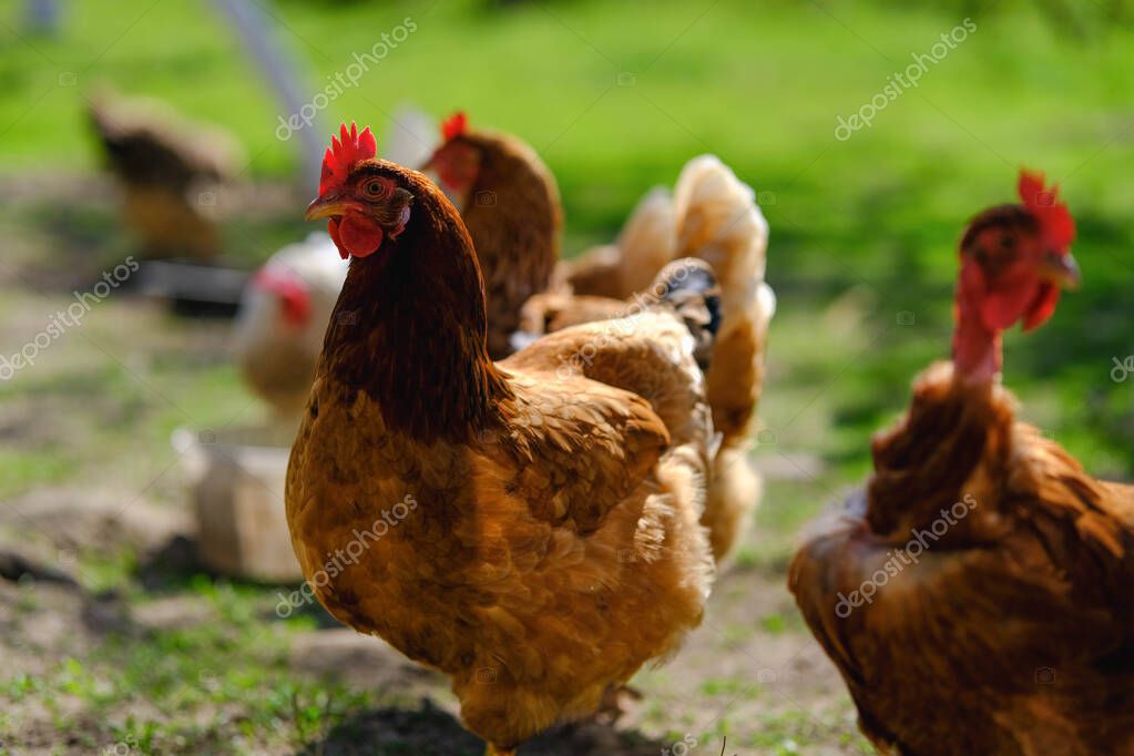Several chickens with reddish-brown feathers and red combs are seen on a patch of green grass and dirt. The focus is on a hen in the foreground.