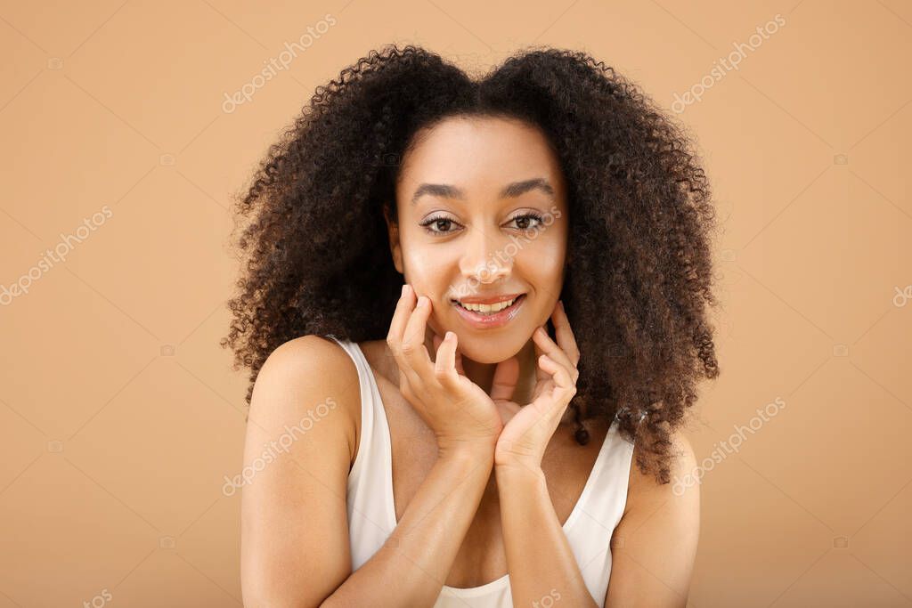 BACKGROUND BEAUTIFUL HAPPY PERSON STUDIO FEMALE SMILING MODEL PORTRAIT HAIR HEALTHY NATURAL FACE CARE BRUNETTE STYLE NICE FASHION AFRICAN SKIN POSE PRETTY RELAX BEIGE ELEGANT STYLISH GLAMOUR WOMAN LIFESTYLE COSMETOLOGY BODY CLEAN HAIRDO HAIRSTYLE CURLY TRENDY LADY CHARMING SEXY VOGUE ATTRACTIVE GORGEOUS POSING CARELESS APPEARANCE AFRO TREND AFRICAN AMERICAN BRAZILIAN