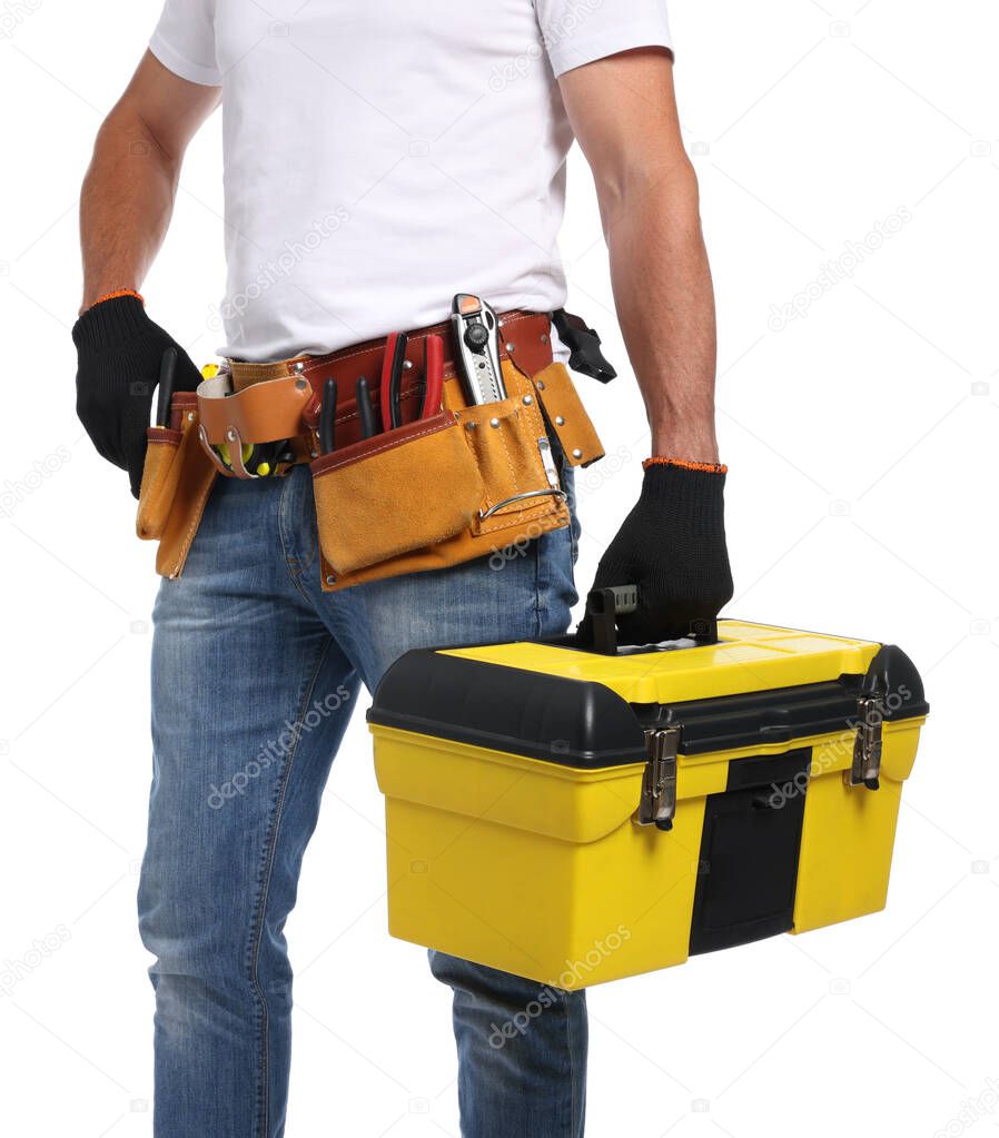 Professional repairman with tool box on white background, closeup