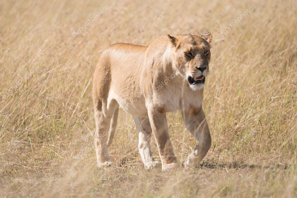 - Sleepy lioness walking slowly across African savannah