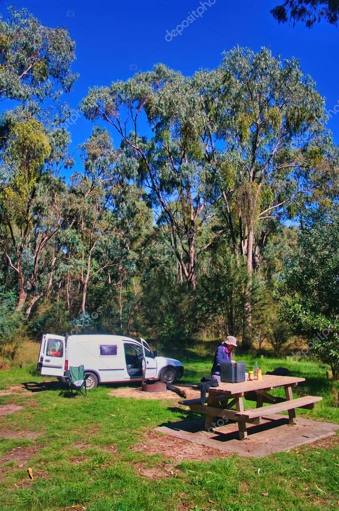 - Middle aged woman with a small campervan preparing food at a camping table in an eucalyptus forest. Burrowa-Pine National Park, Victoria, Australia