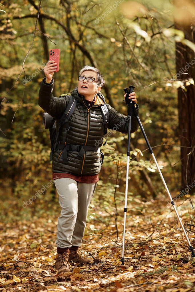 - A senior woman with hiking gear explores a colorful forest, capturing the beauty of her journey.
