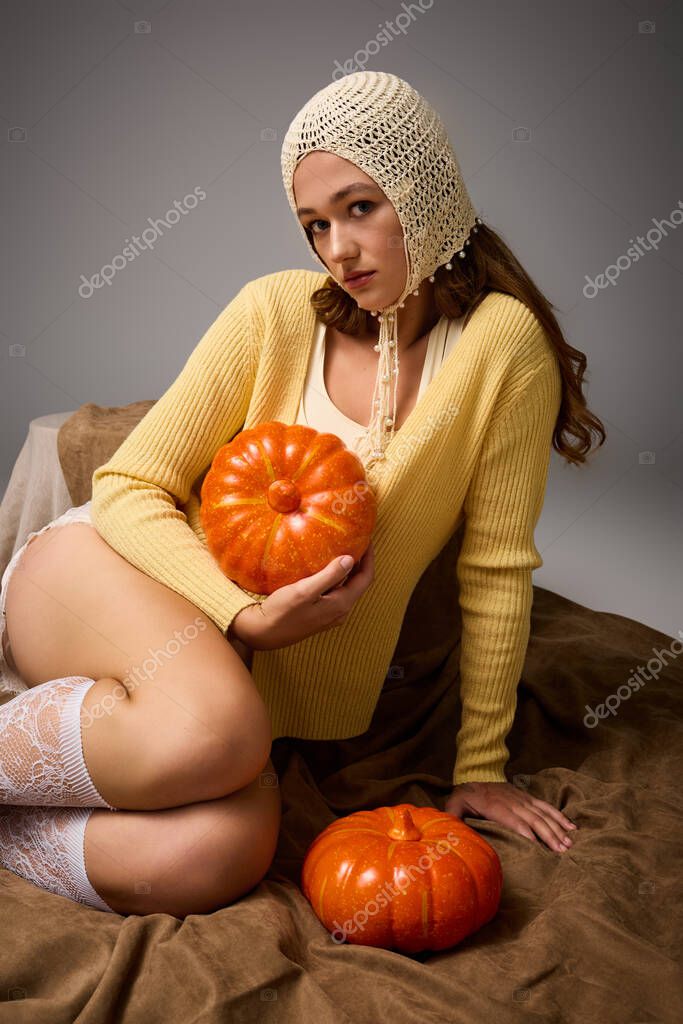 BEAUTIFUL ART DECOR ELEGANCE SEASONAL YOUNG MODEL COMFORTABLE AUTUMN PORTRAIT LIGHT NATURAL PLAYFUL STYLE RUSTIC FASHION EXPRESSION POSE CREATIVE SOFT INDOOR COZY WOMAN WARMTH ACCESSORIES FEMININE TRENDY CASUAL LIGHTING KNITWEAR SETTING CHARM TEXTURES FASHIONABLE CULTURAL ALLURE ATTIRE BOUTIQUE AMBIANCE PUMPKINS INVITING PERSONALITY AESTHETICS LEGWEAR