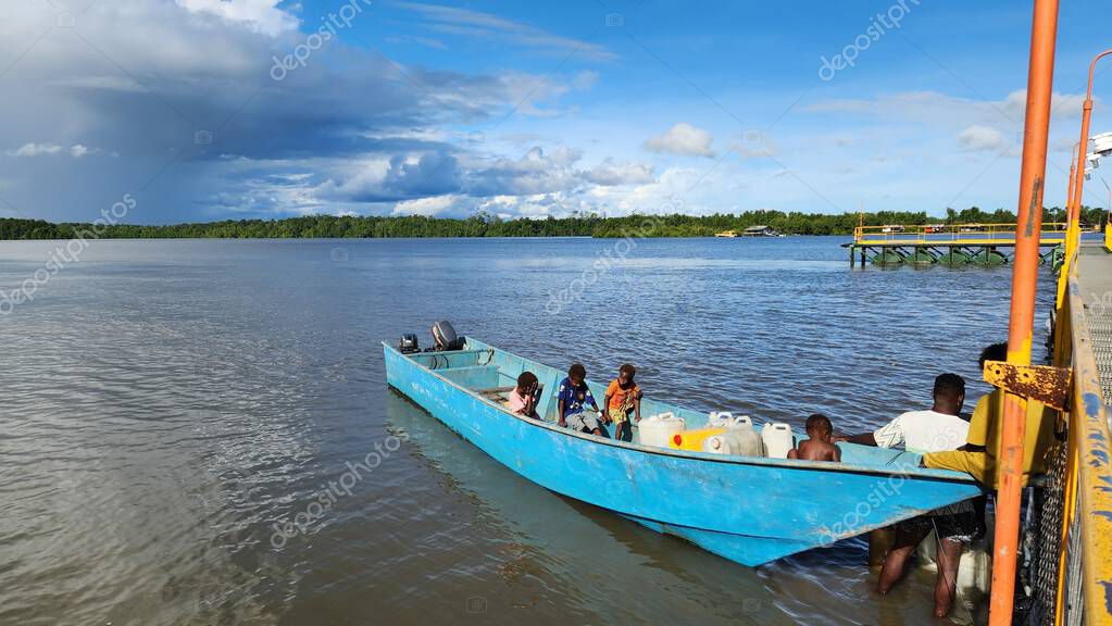 - Papuan locals cross the sea in a wooden boat near coastal Papua, Indonesia. Daily transportation between islands. Captured on June 28, 2025. Papua, Indonesia