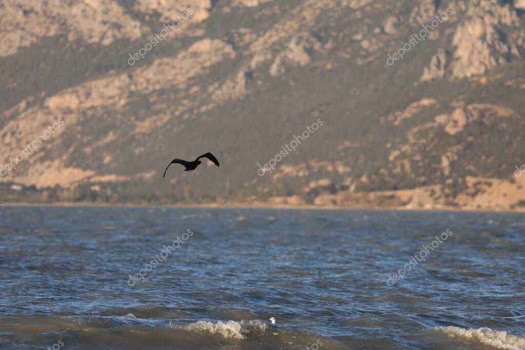 - A bird above the water, a cormorant. a large black bird on a lake in Turkey.Mountainous lake scenery.High quality photo