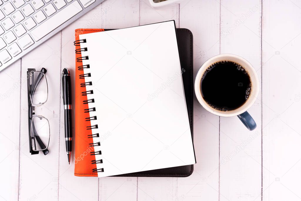 - Blank notepad with cup of coffee and computer keyboard flat lay